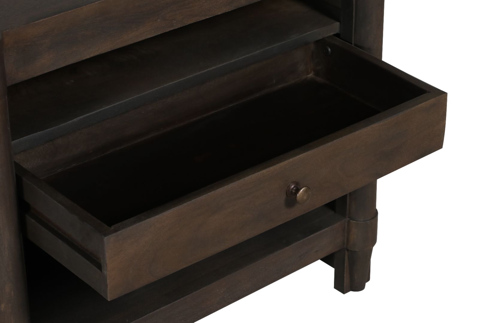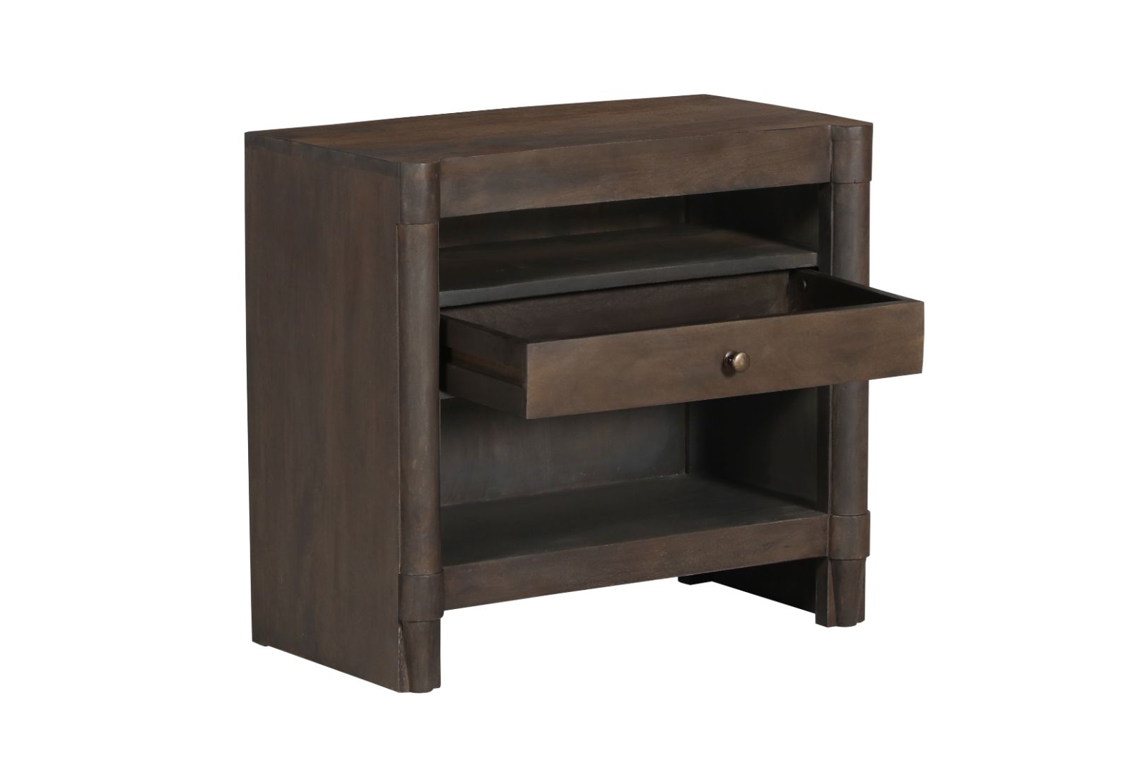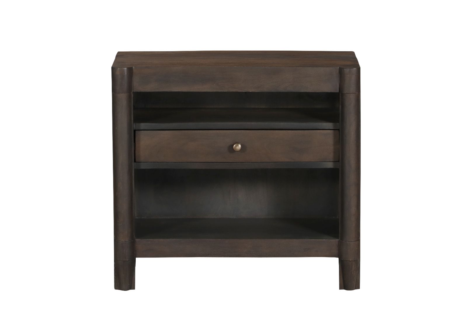 "The Aaron Nightstand is expertly crafted from Mango Wood, ensuring strong and durable construction. Its compact design boasts one drawer and two shelves, perfect for keeping your bedroom essentials organized and within reach. Elevate your bedroom with this sleek and functional nightstand."