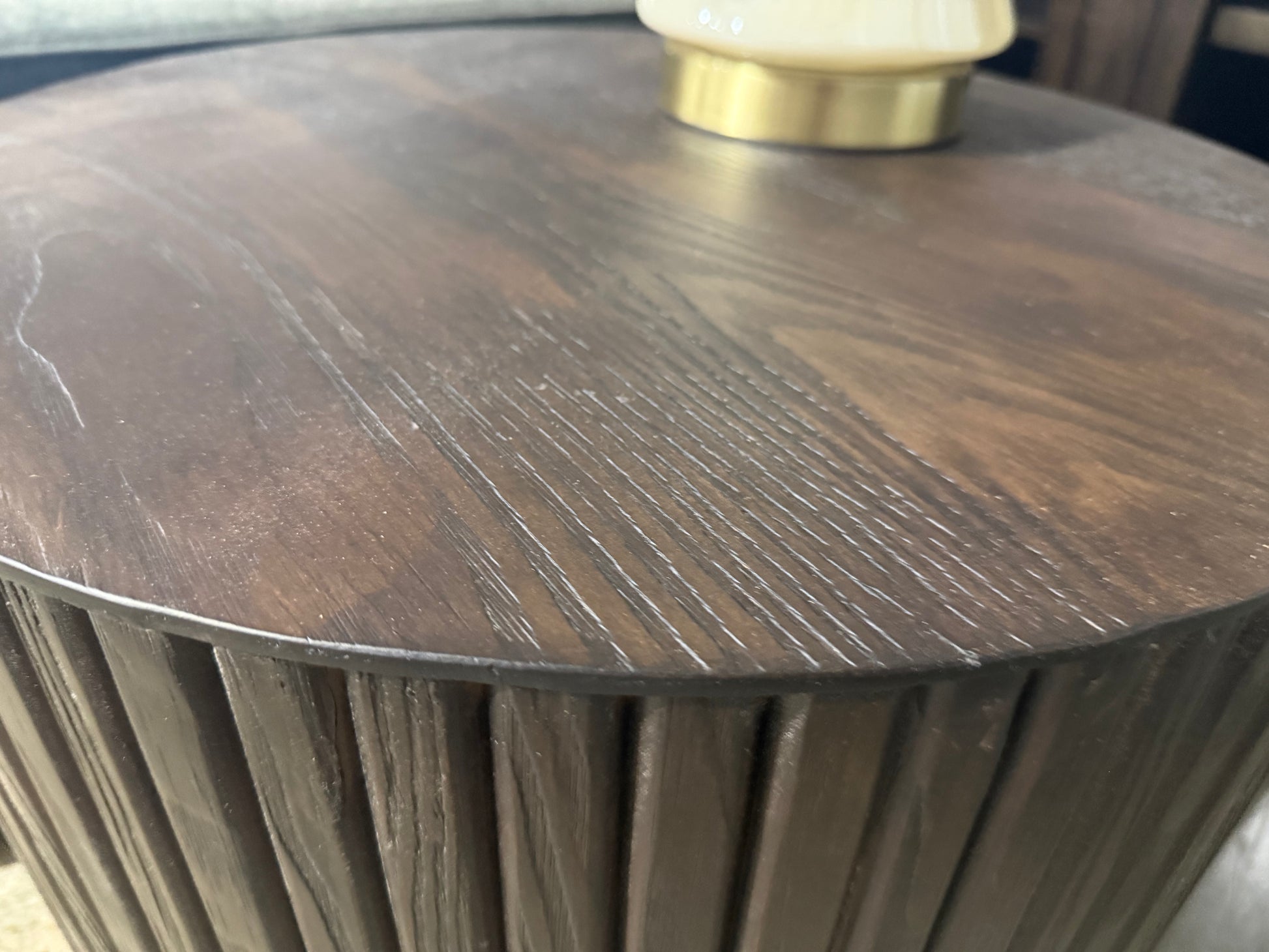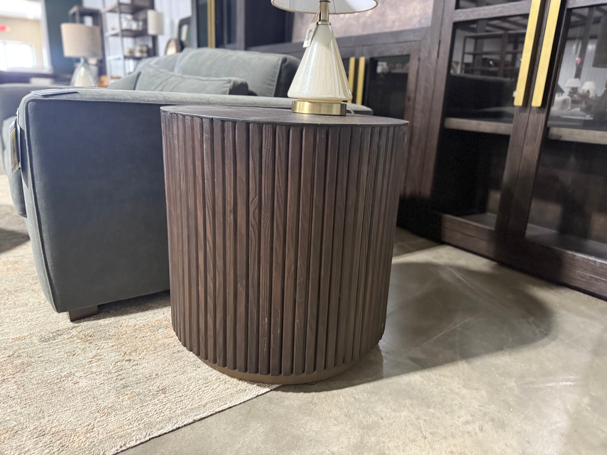 Crafted from solid pine wood, the Hackett End Table features a 24-inch diameter tabletop with elegant reeded sides that add texture and sophistication. Designed to complement the Hackett Coffee Table, it offers durable construction and a cohesive aesthetic for your living space. Its solid wood build ensures lasting stability while enhancing the room’s natural warmth and charm.