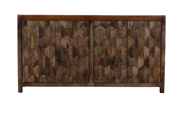 Crafted with solid mango wood, the Scales 4 Door features a unique scaled door design and 4 push doors. This pieces offers a modern touch to any space while providing ample storage options. Elevate your home decor with this expertly crafted and stylishly designed cabinet.